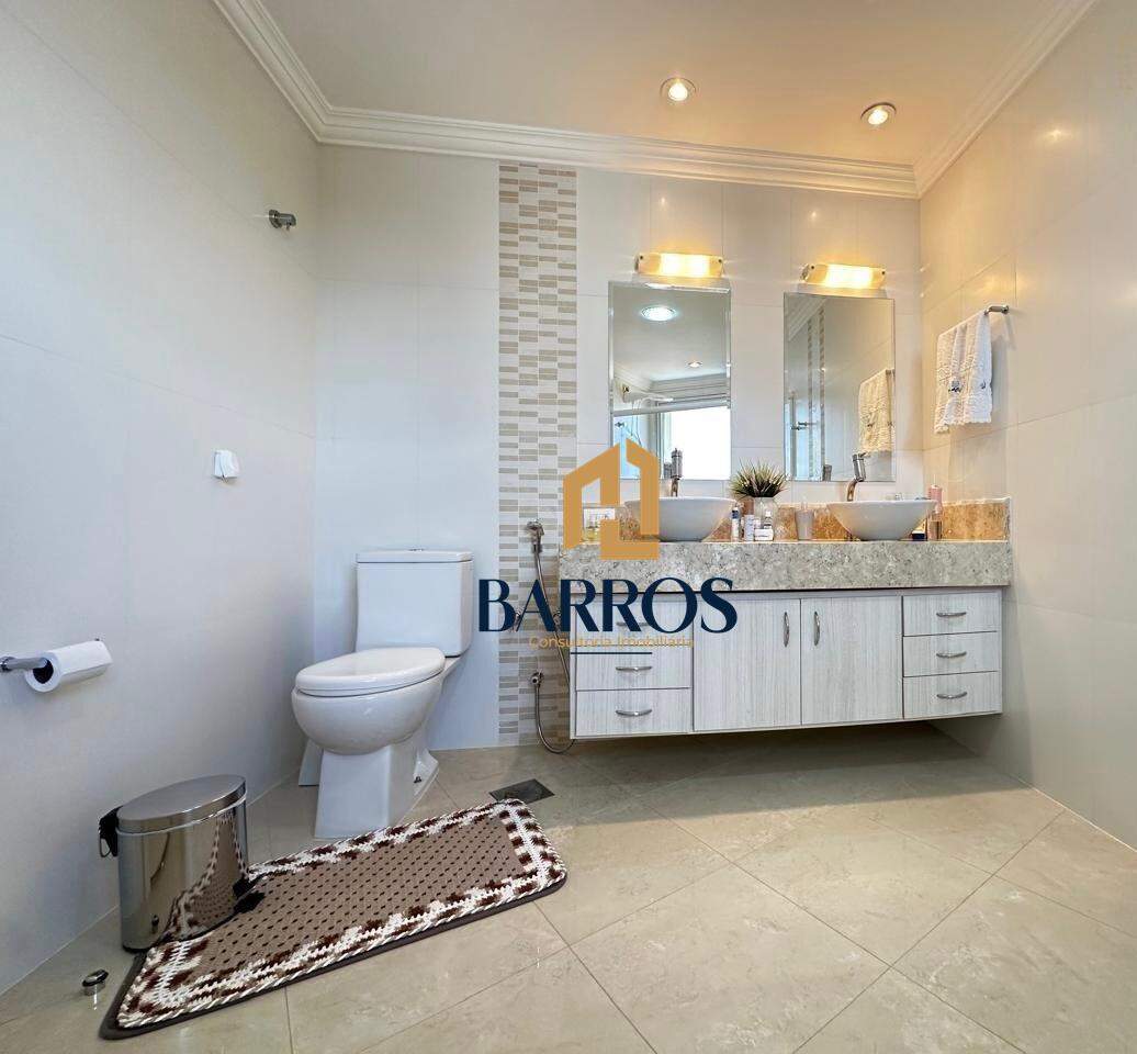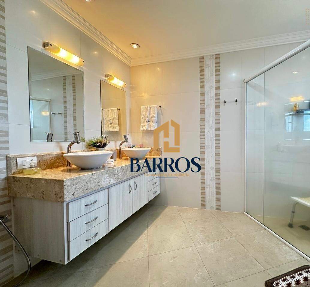 WC da suíte e social em fino acabamento com armários na bancada da pia e box em vidro temperado.