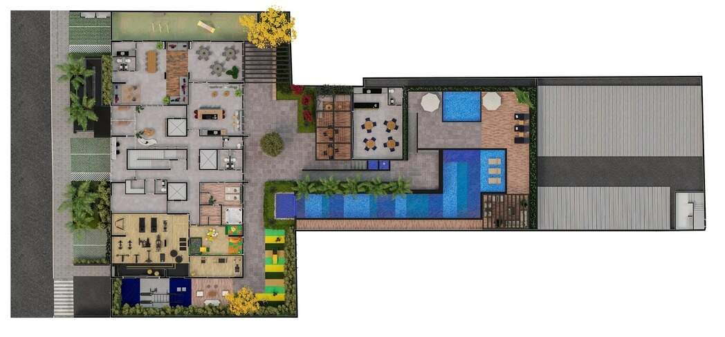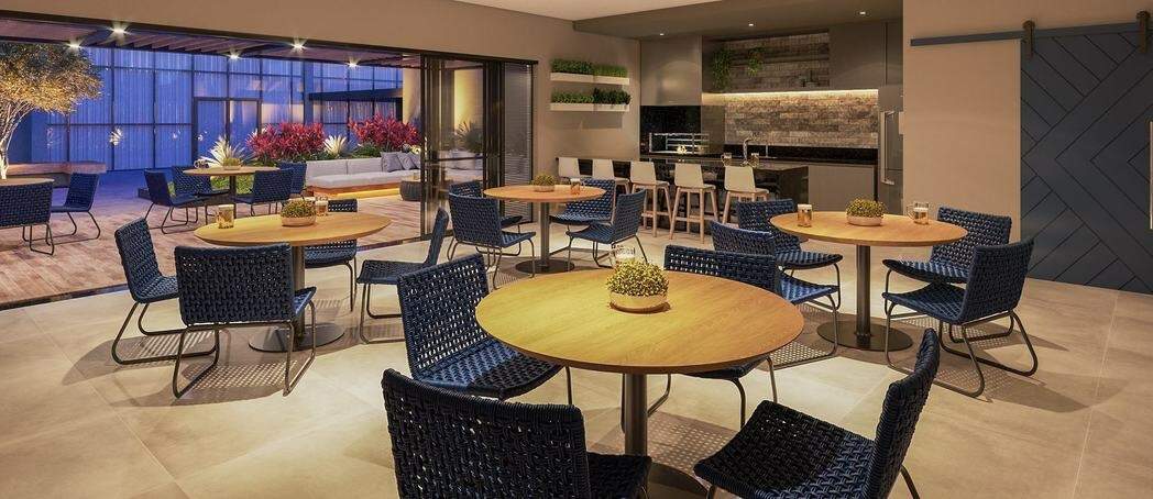 Pub gourmet, salão de festas com copa de apoio, pergolado, pilates, espaço funcional, brinquedoteca, espaço relax com sauna úmida e jacuzzi, lobby, piscina com raia de 25m, adulta e infantil.