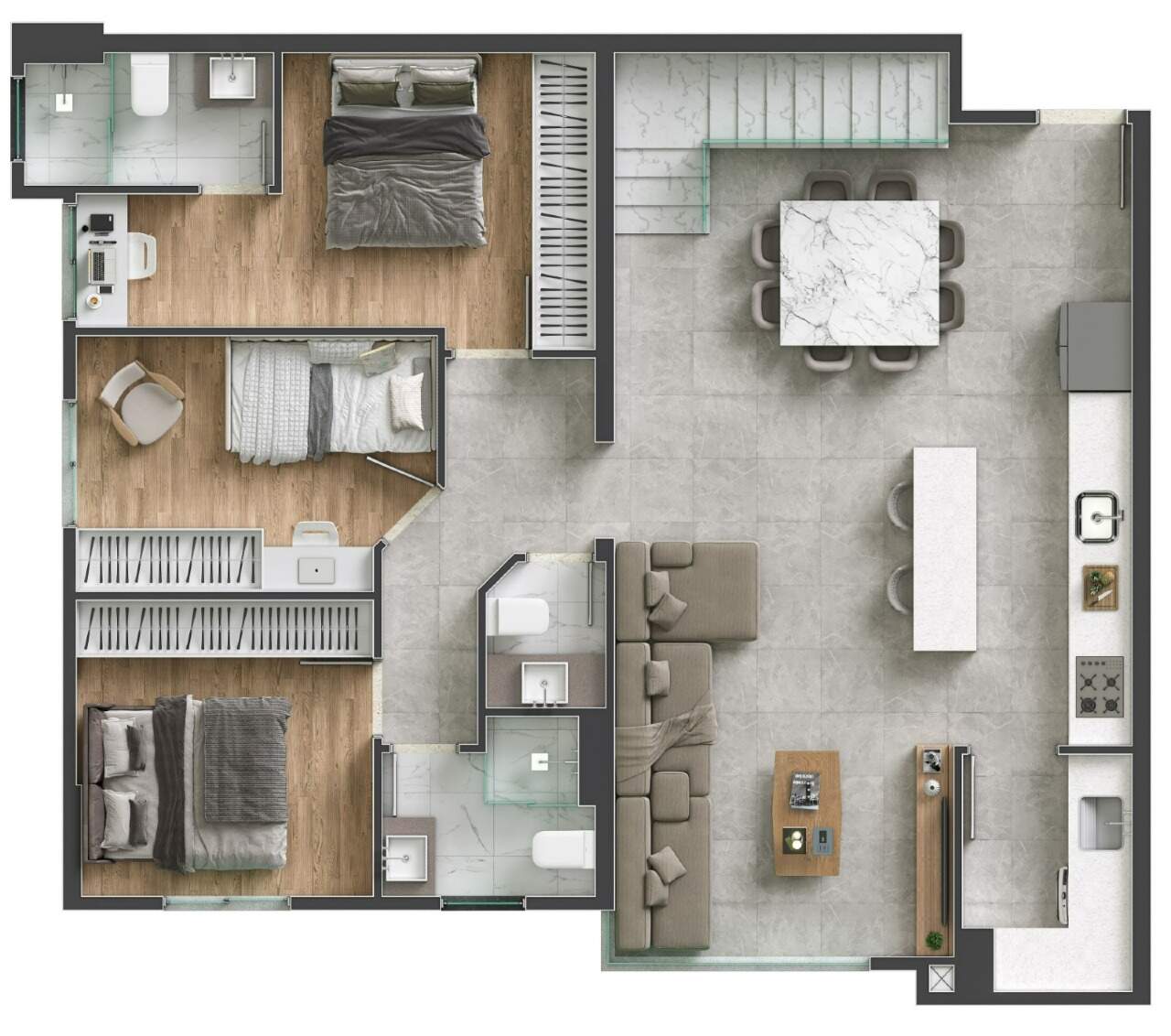 - Coberturas de 172,84 m² com 4 dormitórios.